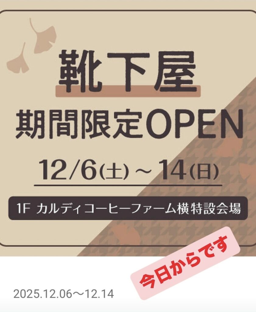 靴下屋からのお知らせ! 総会情報 2025.12.06 \ 靴下屋ファンのみなさまへ / あの人気ショップ「靴下屋」が、期間限定でゆめシティに登場しています! 開催期間:本日12月6日(土)~14日(日)までの9日間。 場所:1階・カルディコーヒーファーム横の特設会場です。 冬の新作から定番アイテムまで、バリエーション豊富にご用意しています。この機会に、靴下屋で“あなたの一足”を見つけてみてはいかがでしょうか?